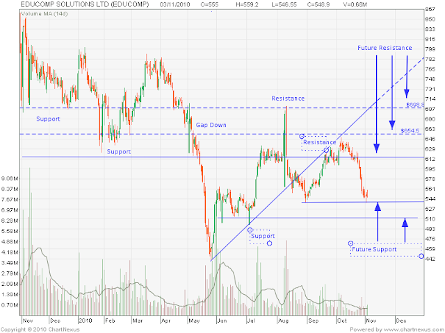 - The blue dot shows a point where the price will have to make a final decision to break out of its Rs 70 resistance line. This will happen in the 4th week of Nov '10.